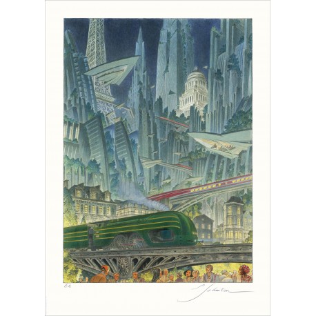 80 × 60 cmÉdition variante colorisée par Jack Durieux du tirage Revoir Paris dont le dessin avait été retravaillé par Laurent Durieux avec comme technique l'utilisation d'un brush en fondu. REVOIR PARIS inscrit au crayon par F. Schuiten au crayon au bas au milieu de chaque estampe.