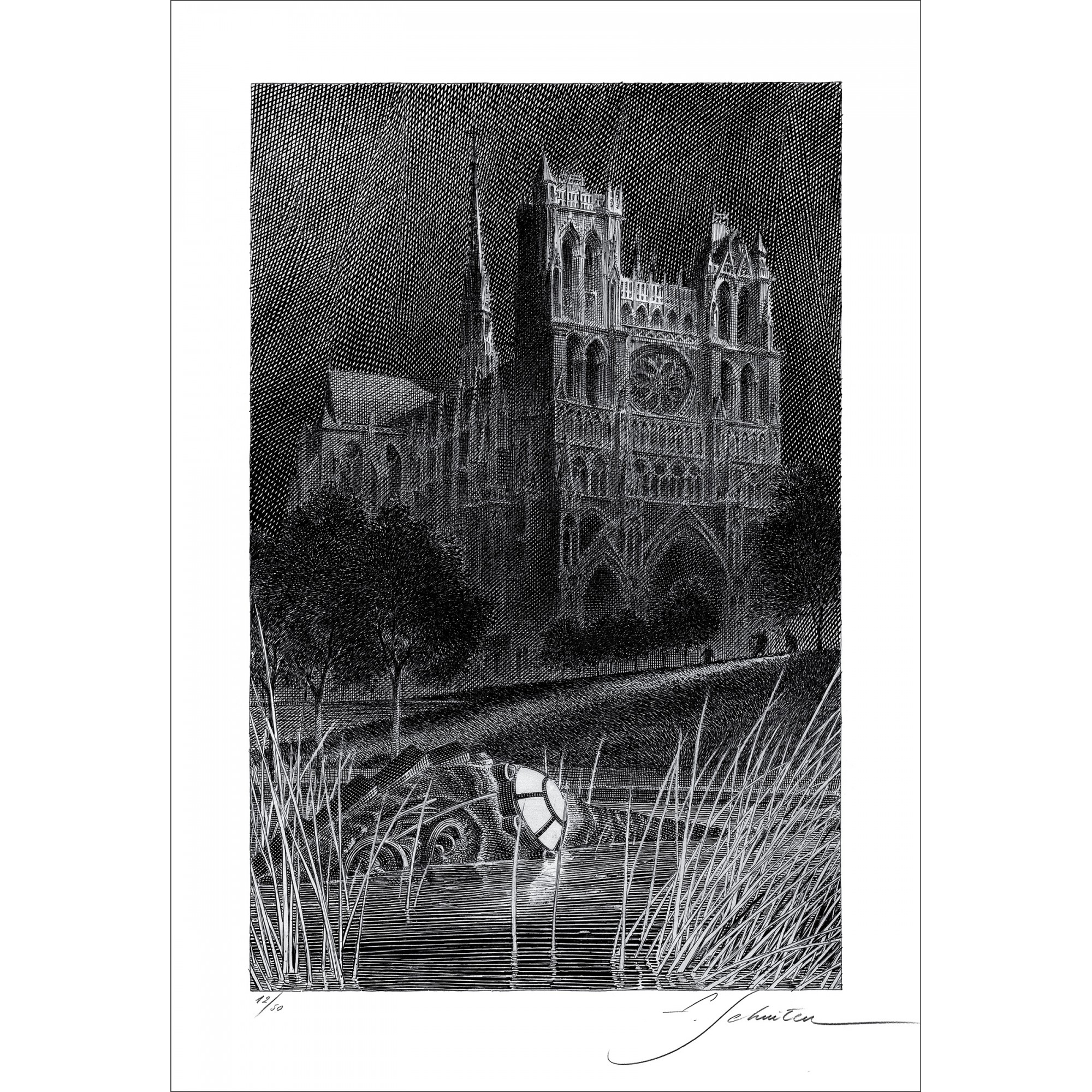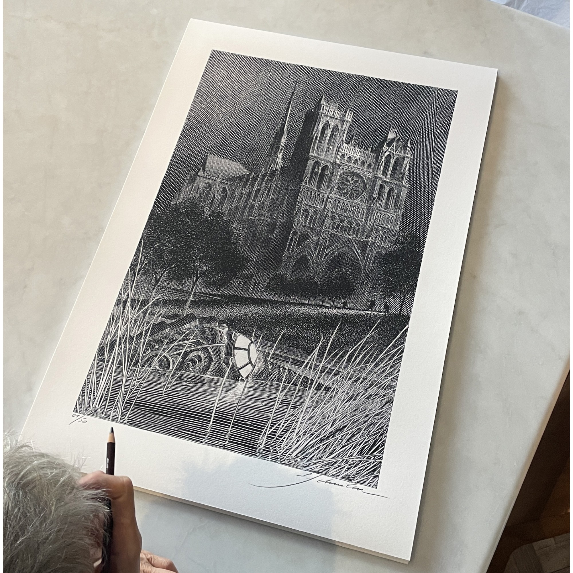 Superbe tirage pigmentaire d'un dessin issu du 'Retour du Capitaine Némo' avec le Nauti-Poulpe sortant de l'eau dans les hortillonnages et la Cathédrale Notre-Dame d'Amiens en arrière plan.