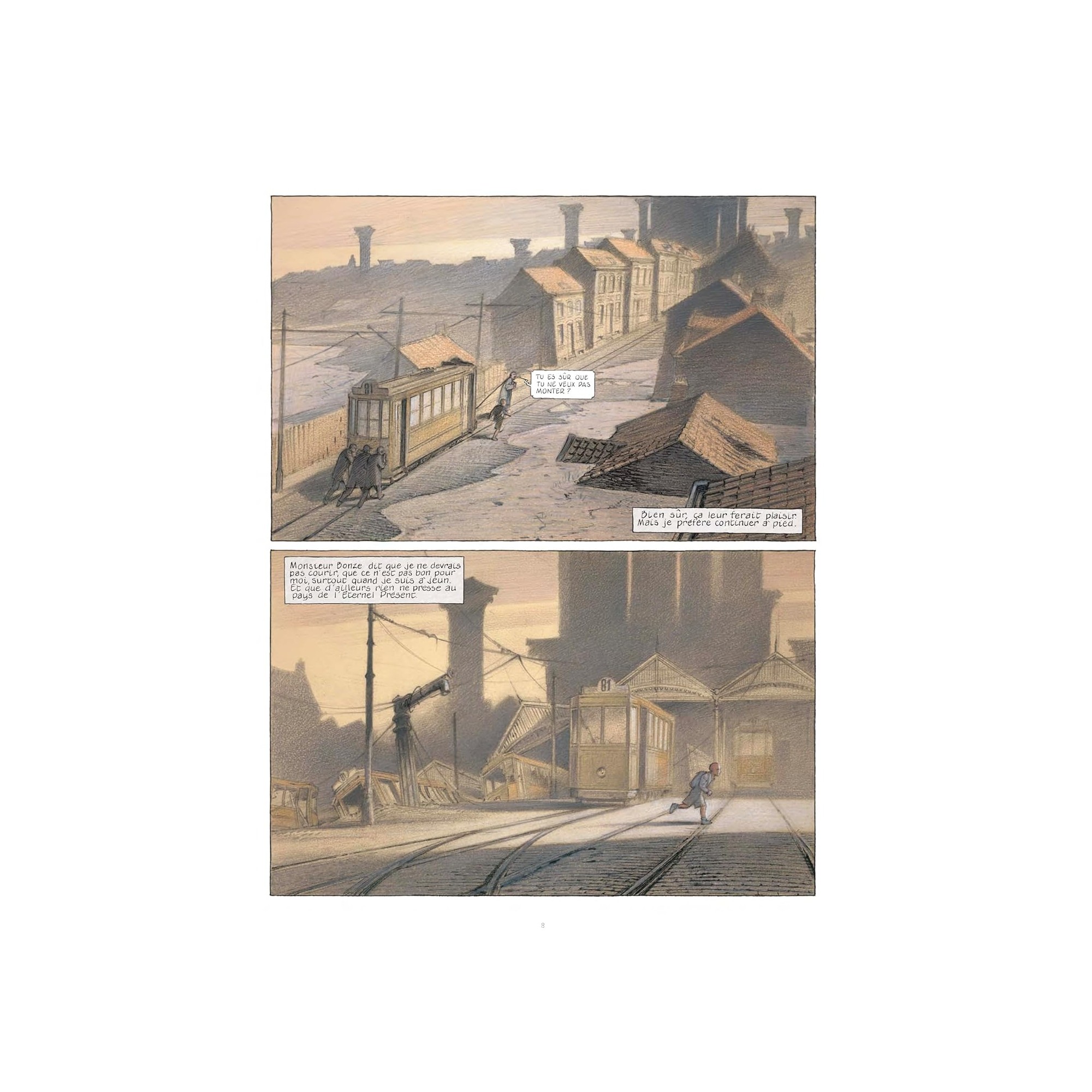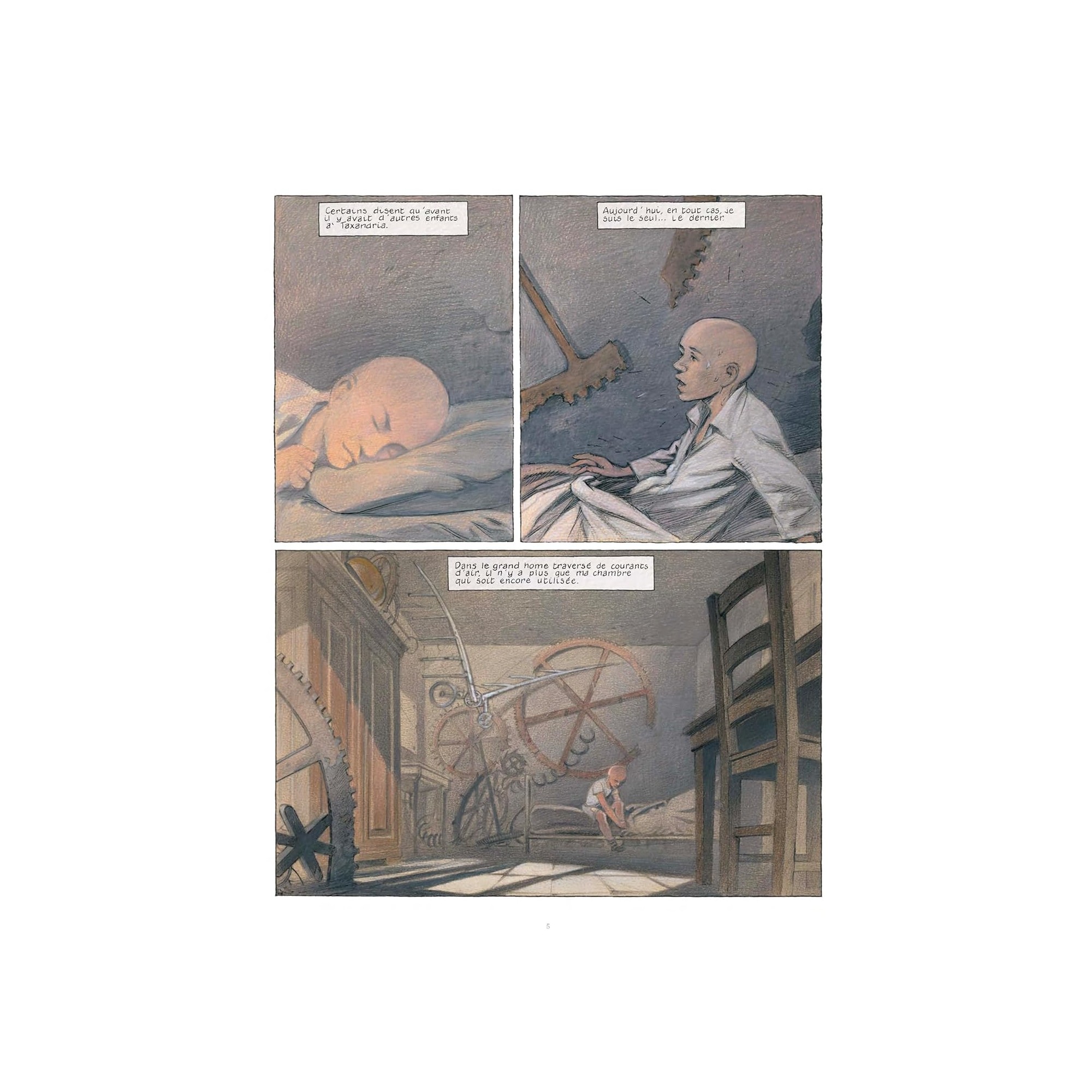 Aimé, un enfant d'une dizaine d'années au crâne rasé, vit à Taxandria, une ville en ruines, emplie de colonnes corinthiennes et de grands palais déserts. Suite à un mystérieux cataclysme, les lois de " L'Eternel Présent " ont été promulguées à Taxandria : toute allusion au passé et au futur y a été interdite, toutes les machines ont été bannies. Aimé découvre un livre d'images qui relate ces terribles évènements. Il est bouleversé par cette lecture et plus rien ne peut désormais l'arrêter. Parviendra-t-il à échapper à l'empire sinistre du monde de l'Eternel Présent ? Le chantier de réédition de la passionnante saga des Cités obscures se poursuit avec cet album épuisé depuis plusieurs années. Ce livre est né de la rencontre des auteurs avec le pionnier belge du cinéma d'animation Raoul Servais, alors qu'il préparait son long-métrage Taxandria, film expérimental baigné dans le surréalisme belge, et inspiré par les oeuvres de Magritte et Delvaux.
