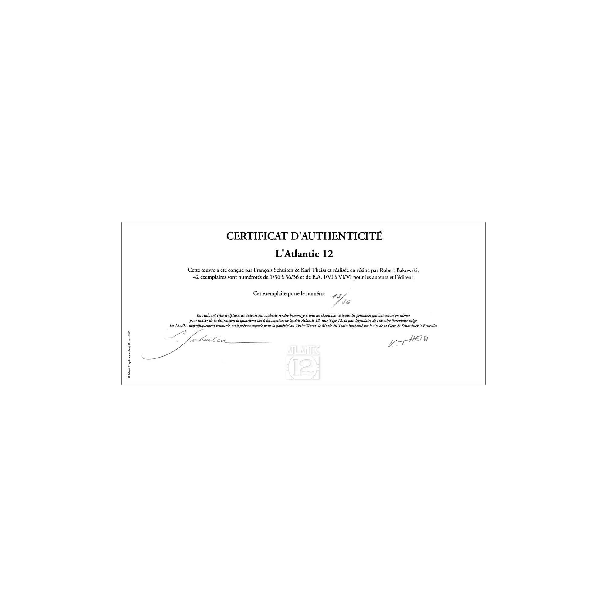 La légendaire locomotive à vapeur, La 12 (de type Atlantic), dont il ne reste plus qu'un exemplaire exposé au Train World (le Musée du Train à Bruxelles) a été redessinée par François Schuiten et sculptée par le maître hébéniste Karl Theiss. C'est l'artisan Robert Bakowski qui s'est chargée de la fabrication en résine, limitée à 36 exemplaires. L'objet est délivré avec un certificat d'authenticité signé par les 2 auteurs.