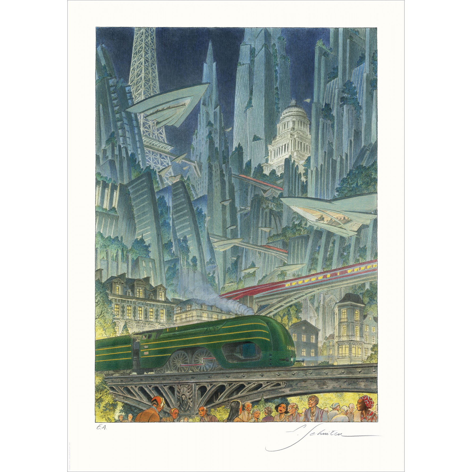 François Schuiten a ensuite gratté le Thalys sur l'original et y a dessiné la Type 12 à la place afin de pouvoir proposer cette illustration au public.